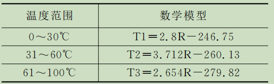PT100電阻的電阻值和溫度具有線性關系 ,不同的溫度會轉換成PT100兩端不同的電壓信號,電壓信號通過A/D換得到對應的A/D值,所以可以根據電路中實測的A/D值以查表的方式計算相應的溫度值。在較大的溫度范圍內,PT100電阻與溫度的線性關系不一致,而在某段小范圍內,兩者的線性關系較好,因此,在系統中采用查表與分段數學建模相結合的方法計算得出較精確的溫度值。算法將測溫范圍 分 成0℃~30℃,31℃~60℃,61℃~100℃3段。在每段溫度區間內,對A/D采集到的電壓溫度信號值的大小與PT100阻值大小的關系根據實際情況進行數學建模。分段數學模型如表1所示。根據此數學模型得到測量理論誤差小于0.1℃,實際測量過程中溫度最大偏差量也小于0.1℃,滿足系統測量精度要求。