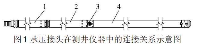 現(xiàn)有的測井儀器大都采用耐高溫的元器件或材料來實現(xiàn)儀器的耐高溫性能,也有用保溫瓶來實現(xiàn)儀器的耐高溫性能;同時,測井儀器(具體地為高溫高壓探頭段)在井下要承受高壓,為了避免儀器因高壓而損壞,在測井儀器強度不夠的地方,就需要耐高壓設計。在選用強度高的材料仍不能滿足要求的情況下,保持儀器的內(nèi)外壓力平衡是防止儀器被壓壞的有效方法。目前,平衡壓力的方法主要是在儀器內(nèi)注硅油,通過保持儀器的內(nèi)外壓力平衡來實現(xiàn)儀器的耐高壓性能。電子線路段對探頭信號進行采集和傳輸,內(nèi)置有電路板以對采集的信號進行處理,其中電子線路段的環(huán)境壓力為1個大氣壓。為確保感應測井儀器在上述高溫高壓環(huán)境下的可靠工作,需要一種承壓接頭,該承壓接頭連接高溫高壓探頭段和電子線路常壓段,實現(xiàn)高低壓的隔離。