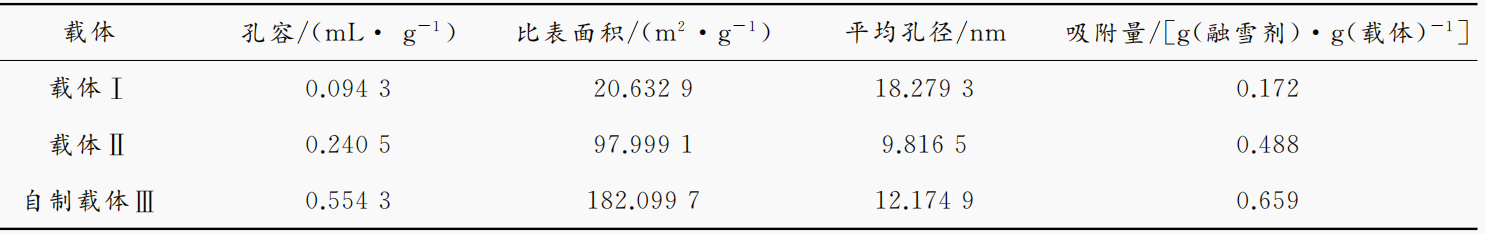 由表1可知,載體I為小孔容、小比表面積、大孔徑型Al203載體;而載體Ⅱ、自制載體Ⅲ為大孔容、大比表面積、小孔徑型Al203載體。而就載體吸附融雪抑冰活性物質來衡量,從求得高吸附量、大比表面積和小孔徑指標來看,自制載體Ⅲ最符合試驗要求。
