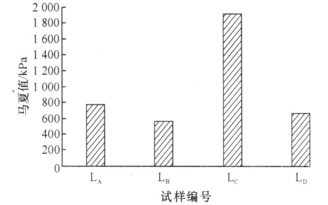 加入不同軟化點瀝青的炮泥試樣的馬夏值見圖1。從圖中可以看出:試樣LC的馬夏值最大,為1915kPa;試樣LB的馬夏值最小,為566kPa;試樣LA和LD的與LB的接近。可見,炮泥的可塑性與瀝青的軟化點之間沒有一定的相關性。瀝青分散于物料間,對物料起潤滑作用,減小物料間相互移動的摩擦力。而炮泥在現場使用時,打炮機的溫度高于瀝青的軟化點,使瀝青熔化并包裹物料,由瀝青的粘結力使物料結合起來而賦予炮泥很大的塑性。根據文獻,瀝青對物料粘結性的作用取決于瀝青各組分的結構性質。所以,炮泥可塑性不隨瀝青軟化點的變化而呈現一定的規律性。